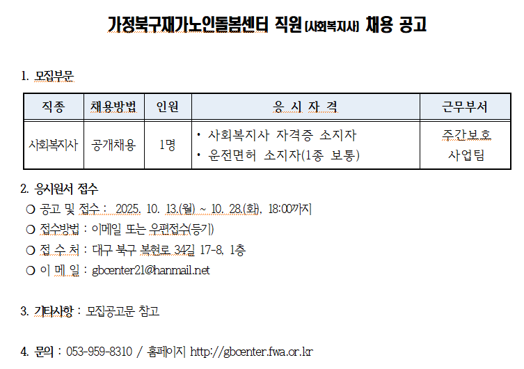 | 가정북구재가노인돌봄센터 직원(사회복지사) 채용공고 |